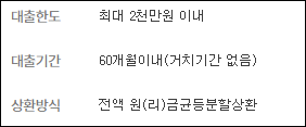 대출기간은 60개월 이내에서 월단위로 신청인이 대출상환기간을 선택할 수 있지만 이자만 납입하는 거치기간은 별도로 운용할 수 없습니다.