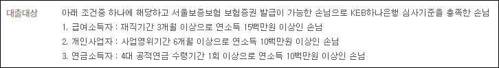 하나은행 사잇돌 중금리대출은 다음의 조건중 하나에 해당하고 서울보증보험 보험증권 발급이 가능한 분이 신청할 수 있습니다.