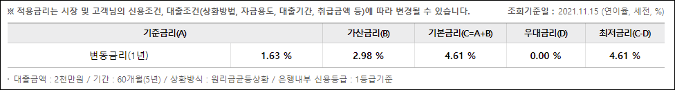 연간 4.61%의 금리가 적용될 수 있지만 신청인의 신용등급 및 연간소득, 대출조건 등에 따라 실제 금리는 달라질 수 있으니 참고만 하시길 바랍니다.