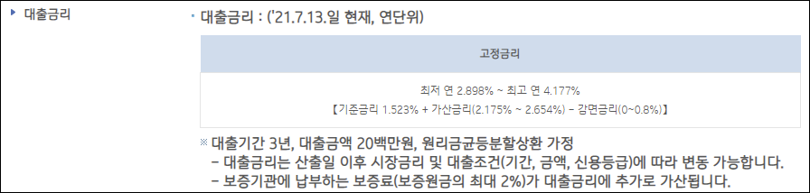 연간 2.898%에서 4.177%의 금리가 적용될 수 있지만 신청시기 및 신청인의 대출조건 등에 따라 실제 금리는 달라질 수 있으니 참고만 하시길 바랍니다.