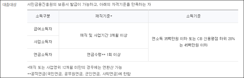- 공통요건 : 개인신용평점과 무관하게 연소득 3500만원 이하 또는 개인신용평점 하위 20%에 해당하면서 연소득 4500만원 이하