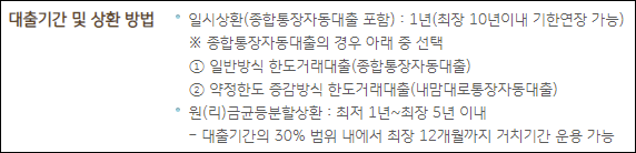 대출기간은 일시상환의 경우 최초 1년으로 약정되며, 만기전 연장신청을 통해 1년단위로 연장하여 최장 10년까지 이용할 수 있습니다.