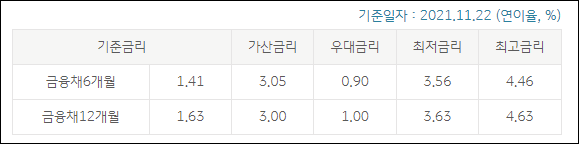 기준 금리는 신청시기의 시장금리에 따라 달라질 수 있으며, 가산금리와 우대금리는 신청인의 신용조건 등에 따라 달라질 수 있습니다.