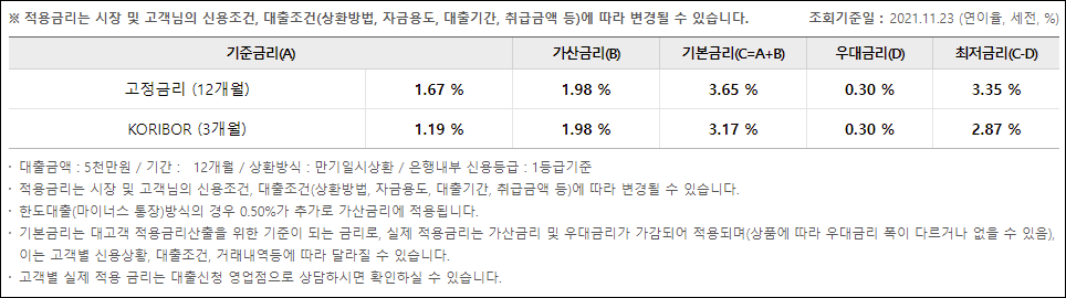 기준금리는 신청시기의 시장금리에 따라 달라질 수 있으며, 가산금리와 우대금리는 신청인의 대출조건 등에 따라 달라지게 됩니다.