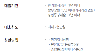 할부상환 : 5년이내로 신청인이 대출 기간을 선택하여 약정할 수 있으며, 이자만 납입하는 거치기간은 부여할 수 없습니다.