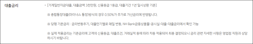 신청시기 및 신청인의 대출조건 등에 따라 실제 금리는 개인별로 차등 적용되니 보다 자세한 금리는 농협은행 영업점으로 문의하시길 바랍니다.