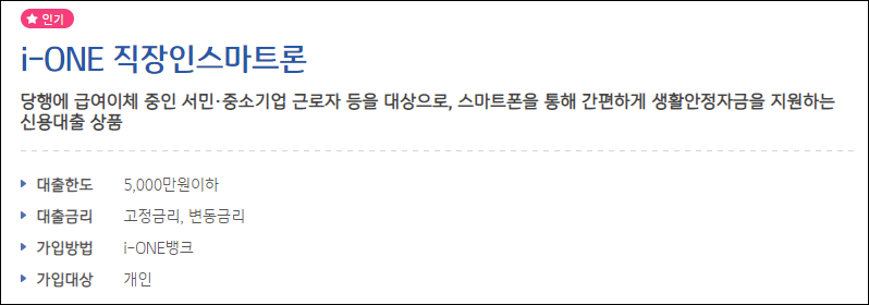 서민근로자 및 중소기업 근로자를 대상으로 스마트폰을 통해 간편하게 생활안정자금을 지원하는 직장인 전용 비대면 신용대출 상품이 있습니다.