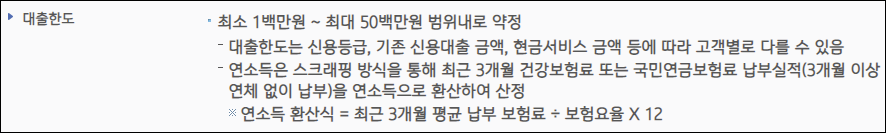 최소 100만원부터 대출 신청이 가능하며, 대출한도는 신청인의 신용등급 및 기존 신용대출 금액, 현금서비스 금액 등을 차감하기 때문에 실제 한도는 개인별로 달라질 수 있습니다.