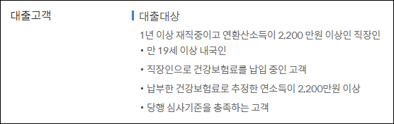 1년이상 재직중이고 연환산소득이 2200만원 이상인 직장인이 아래의 요건을 모두 충족하면 대출 신청이 가능합니다.