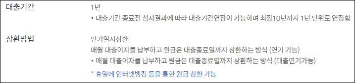대출기간은 최초 1년으로 약정되며, 만기전 연장신청을 통해 1년 단위로 연장하여 최장 10년까지 이용할 수 있습니다.