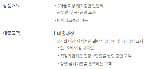 3개월 이상 연속하여 재직중인 일반직 공무원 및 국공립 교사가 아래의 요건을 모두 충족하면 대출 신청이 가능합니다.