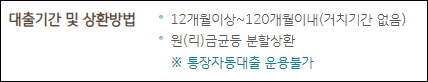 대출기간은 12개월 이상 120개월 이내에서 신청인이 원하는 기간을 선택할 수 있지만 이자만 납입하는 거치기간은 운용할 수 없습니다.