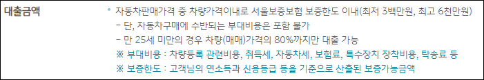 최저 300만원에서 최고 6000만원까지 한도가 책정되며, 만 25세 미만의 경우 차량가격의 80%까지만 대출이 가능합니다.