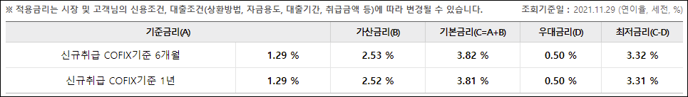 기준 금리는 신청시기의 시장금리에 따라 달라질 수 있으며, 가산금리와 우대금리는 신청인의 신용등급 등에 따라 다르게 적용됩니다.