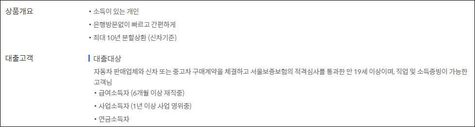 자동차 판매업체와 신차구입 계약을 체결하고 서울보증보험의 적격심사를 통과한 만 19세 이상 대한민국 국민이 아래의 요건 중 하나를 충족하면 대출 신청이 가능합니다.