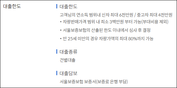 실제한도는 서울보증보험에서 산출된 한도 이내로 결정되며, 만 25세 미만의 경우 차량가액의 최대 80%까지 대출이 가능합니다.