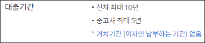 신한은행 신차구입대출의 상환기간은 최대 10년 이내에서 신청인이 대출기간을 선택할 수 있으며, 이자만 납입하는 거치기간은 운용할 수 없으니 이용에 참고하시길 바랍니다.
