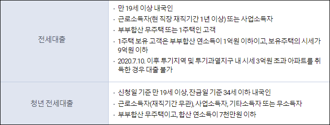 일반 전세대출의 경우 만 19세 이상 내국인이 현 직장에 1년이상 연속하여 재직중이거나 1년이상 사업을 영위하고 있는 사업소득자가 신청할 수 있습니다.