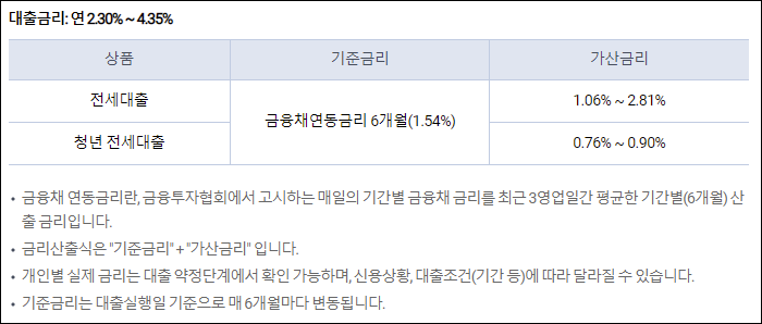 연간 2.30%~4.35%의 금리가 적용될 수 있지만 신청시기 및 대출금액 및 조건 등에 따라 실제 금리는 달라질 수 있으니 참고만 하시길 바랍니다.