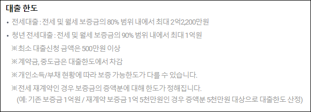 청년 전세대출의 경우에는 전세 및 월세보증금의 90% 범위내에서 최대 1억원까지 신청이 가능합니다.