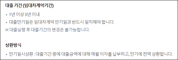 대출기간은 1년이상 3년이내로 약정되며, 대출만기일은 임대차계약 만기일과 반드시 일치해야 하니 참고하시길 바랍니다.