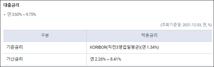 연간 3.60%에서 9.75%의 금리가 적용될 수 있지만 신청시기 및 대출조건 등에 따라 실제 금리는 달라질 수 있으니 참고만 하시길 바랍니다.