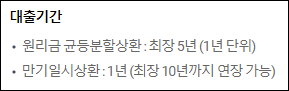 분할상환의 경우 대출실행 이후에는 대출 상환기간을 변경하거나 연장할 수 없으니 본인의 상환여력을 충분히 고려하여 신중히 결정하시길 바랍니다.