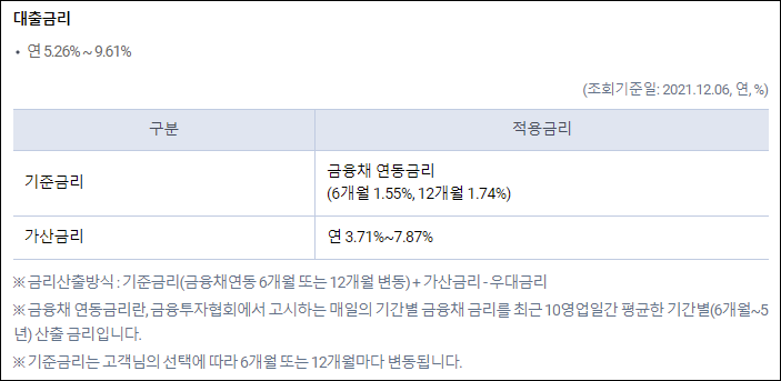 연간 2.56%에서 9.61%의 금리가 적용될 수 있지만 신청시기 및 대출조건 등에 따라 실제 금리는 달라질 수 있으니 참고만 하시길 바랍니다.