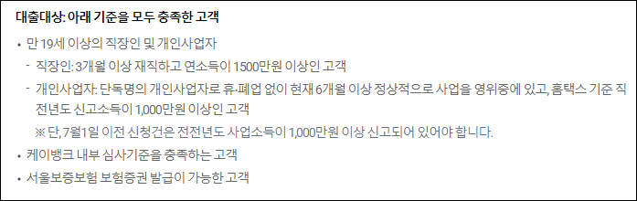 케이뱅크 사잇돌대출은 만 19세 이상의 직장인 및 개인사업자가 아래의 요건을 충족하면 신청할 수 있습니다.