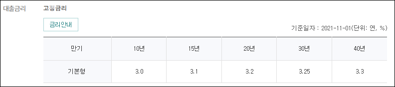 대출상환기간을 20년으로 약정한 경우 대출금리는 연 3.2%이며, 30년 약정시 연 3.25%, 40년 약정시 연 3.3%의 금리가 적용되니 참고하시길 바랍니다.