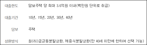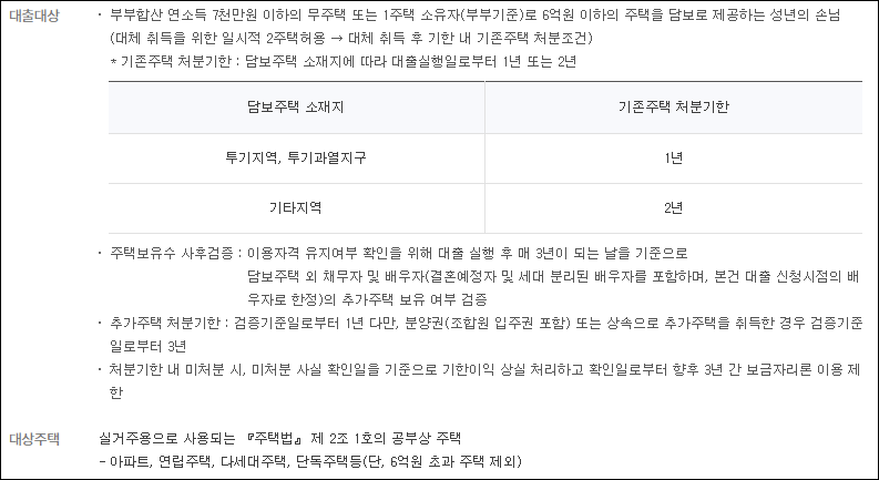 대출가능 주택은 실거주용으로 사용되는 아파트, 연립주택, 다세대주택, 단독주택 등이며 6억원을 초과하는 주택은 제외되니 참고하시길 바랍니다.