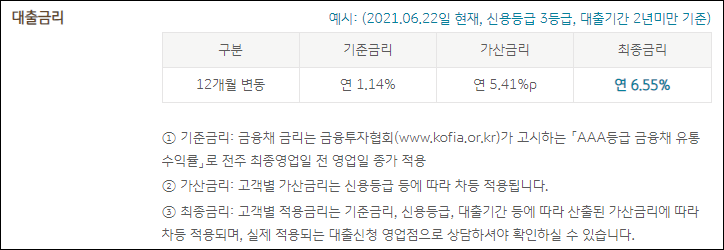 연간 6.55%의 금리가 적용될 수 있지만 신청시기 및 대출조건 등에 따라 실제 금리는 달라질 수 있으니 참고만 하시길 바랍니다.