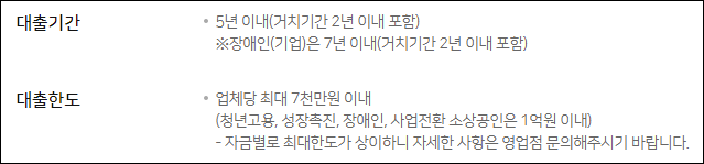 장애인 기업은 최대 7년까지 대출기간을 약정할 수 있고 거치기간 2년과 원금과 이자 분할상환기간 5년으로 나누어 이용할 수 있으니 참고하시길 바랍니다.