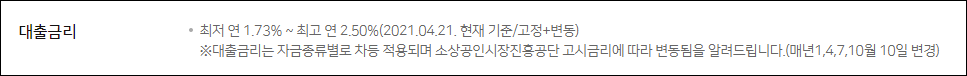 연간 1.73%에서 2.50%의 금리가 적용될 수 있지만 신청시기 및 대출조건 등에 따라 실제 금리는 달라질 수 있으니 참고만 하시길 바랍니다.