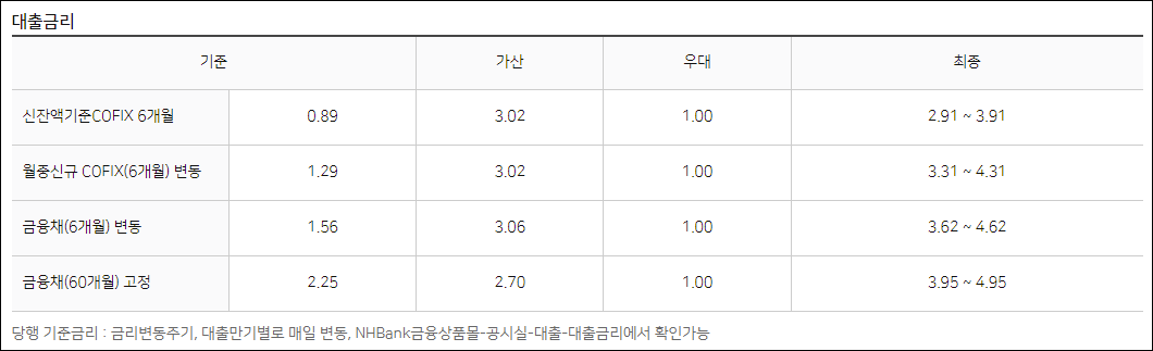 기준 금리는 신청시기의 시장금리에 따라 달라질 수 있으며, 가산금리와 우대금리는 신청인의 대출조건 등에 따라 달라질 수 있습니다.