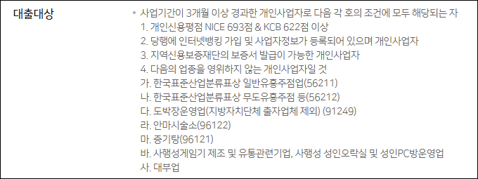 - 개인신용평점 NICE 693점, KCB 622점 이상인 소상공인