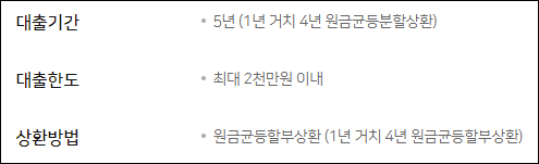 이 기간중 1년은 이자만 납입하는 거치기간으로 활용되며, 나머지 4년간 원금과 이자를 분할하여 상환하게 됩니다.