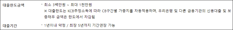 대출한도는 KCB추정소득에 따라 신용구간별 가중치를 차등적용하며, 우리은행 및 다른 금융기관의 신용대출을 보유하고 있는 경우 해당 금액만큼 차감하고 남은 금액만큼 책정됩니다.