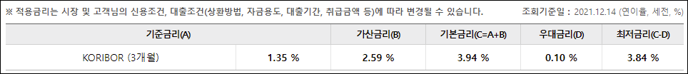 기준금리는 신청시기의 시장금리에 따라 달라질 수 있으며, 가산금리와 우대금리는 신청인의 대출조건 등에 따라 달라지게 됩니다.