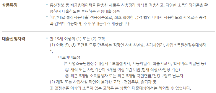 국민은행 무직자 신용대출은 통신정보 등 비금융 데이터를 활용하여 새로운 신용평가 방식을 적용하고 다양한 소득인정 기준을 활용하여 대출한도를 부여하는 신개념의 신용대출 상품입니다.