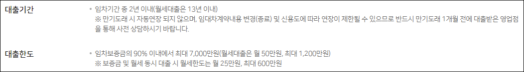 대출기간은 전세자금의 경우 임차기간 2년 이내로 약정되며, 월세대출은 최장 13년까지 이자만 납입하고 원금의 납부는 유예할 수 있으니 참고하시길 바랍니다.