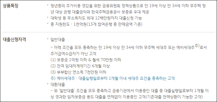 만 19세 이상 만 34세 이하 무주택 세대주 또는 예비세대주가 아래의 요건을 모두 충족하면 대출신청이 가능합니다.