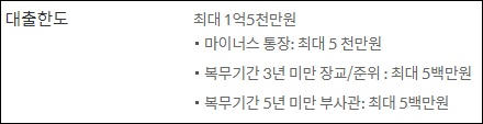 복무기간 3년 미만의 장교 및 준위, 복무기간 5년 미만의 부사관은 최대 500만원까지 한도가 책정될 수 있습니다.