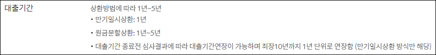 만기일시상환의 경우 최초 1년으로 약정되며, 대출기간 만료전 연장신청을 통해 1년단위로 연장하여 최장 10년까지 이용할 수 있습니다.