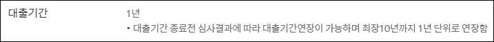 대출기간은 최초 1년으로 약정되며, 만기전 연장신청을 통해 1년 단위로 연장하여 최장 10년까지 이용할 수 있습니다.