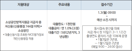 개인신용평점이 낮은 소상공인에게 지원하는 대출 상품으로 1천만원까지 대출 신청이 가능합니다.