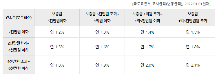 부부합산 연소득이 적을 수록,임차보증금액이 적을 수록 금리가 낮아지는 구조입니다.