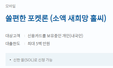 신한은행 쏠편한 포켓론은 쏠(Sol) 앱을 통해 신청할 수 있으며, 보다 자세한 대출가능여부는 쏠 어플을 통해 확인해보시길바랍니다.