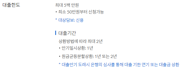 최소 50만원부터 신청이 가능하며, 대출한도는 신청인의 대출조건 및 상환여력에 따라 다르게 책정될 수 있습니다.