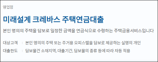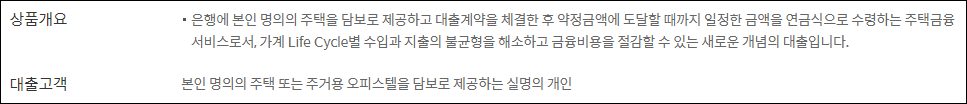 본인 명의의 주택을 담보로 제공하고 약정금액에 도달할 때까지 매월 일정한 금액을 연금식으로 지급받는 주택연금대출 상품이 있습니다.